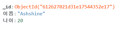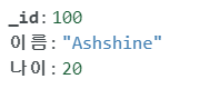 {이름: 'Ashshine', 나이:20 ,_id: 100}