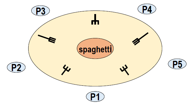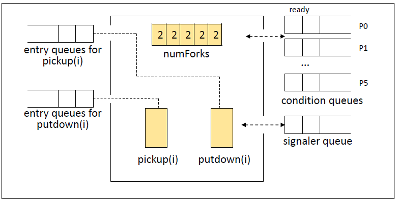 - 내가 포크를 집는다는 것은 내 왼쪽 오른쪽의 철학자들은 사용 가능한 포크가 1개씩 줄어든다는 의미