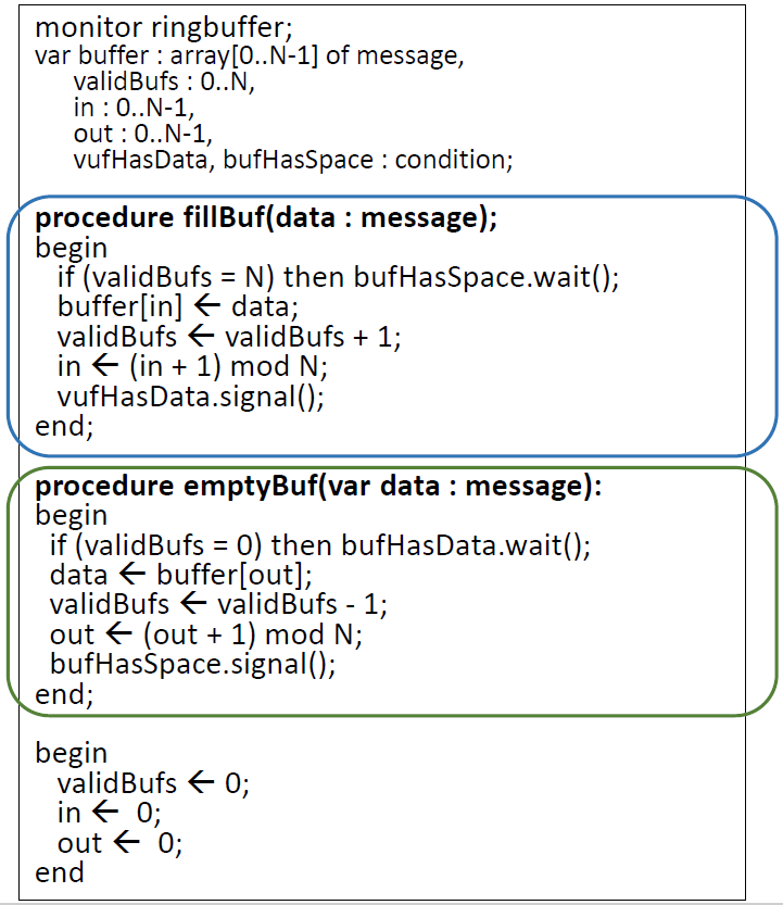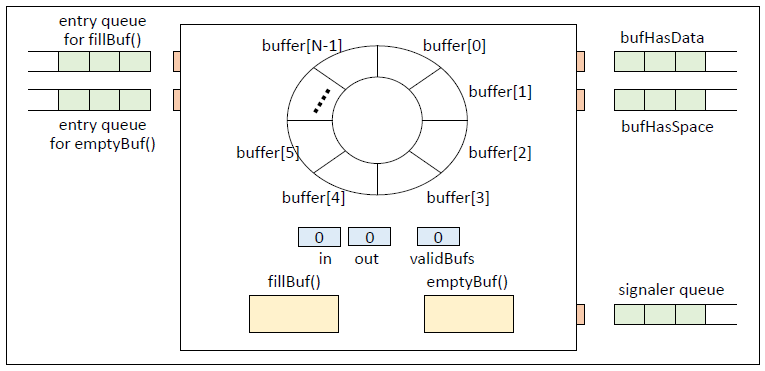- => entry queue for fillBuf() (데이터를 넣음), entry queue for emptyBuf() (데이터를 사용)