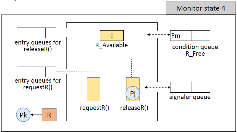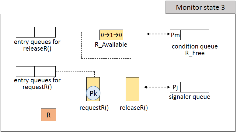 - R_Available은 0에서 1이 된다. (이후 Pj가 바로 Pk를 깨우러 간다면 Monitor에 Pj가 있기 때문에 Pk는 Monitor에 진입하지 못한다)