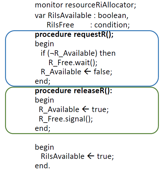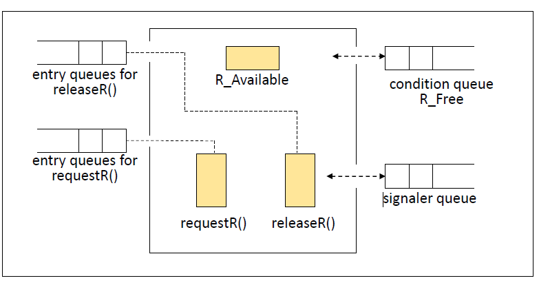 - 자원이 없으면 condition queue(R_Free)에서 기다려라(wait)