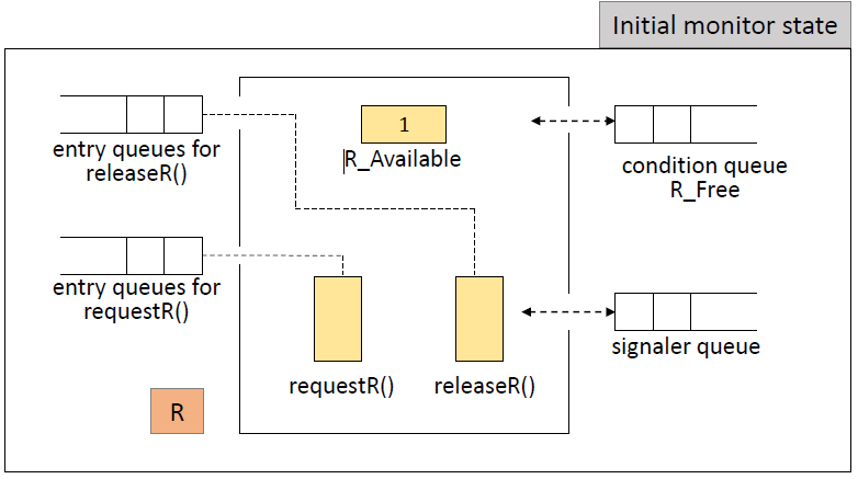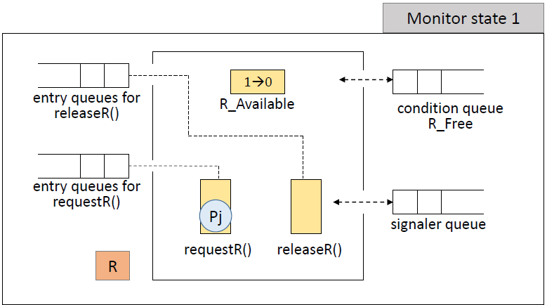 - 프로세스 Pj 가 모니터 안에서 자원 R 을 요청