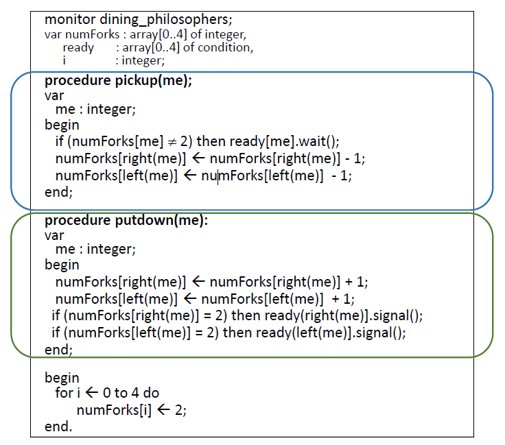 - procedure pickup 에서는 내가 사용할 수 있는 포크가 2개인가 를 검사함