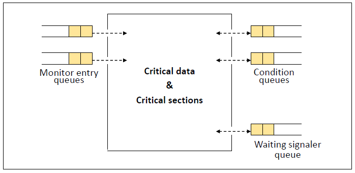 - 모니터 내에는 항상 하나의 프로세스만 진입 가능 (Lang 가 보장함)