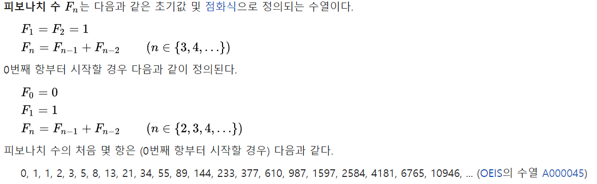 피보나치 수는 0과 1로 시작한다. 0번째 피보나치 수는 0이고, 1번째 피보나치 수는 1이다. 그 다음 2번째 부터는 바로 앞 두 피보나치 수의 합이 된다. 이를 식으로 써보면 Fn = Fn-1 + Fn-2 (n ≥ 2)가
